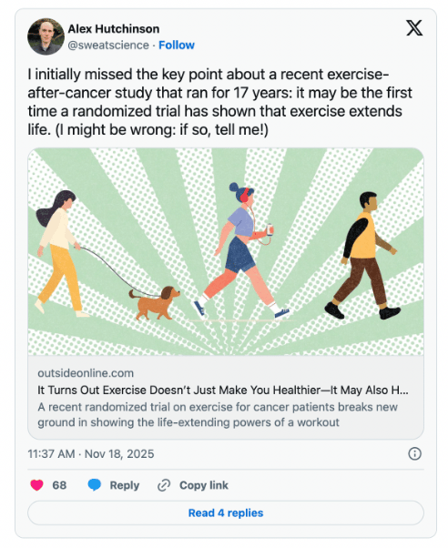 And finally, in this article, author Alex Hutchinson reviews a landmark randomized trial that found that for patients recovering from colon cancer, a structured exercise program after treatment dramatically increased survival rates. Over three years of guided activity (roughly 2.5 hours of brisk walking per week), participants were significantly less likely to die or have cancer return, even over eight years of follow‑up.