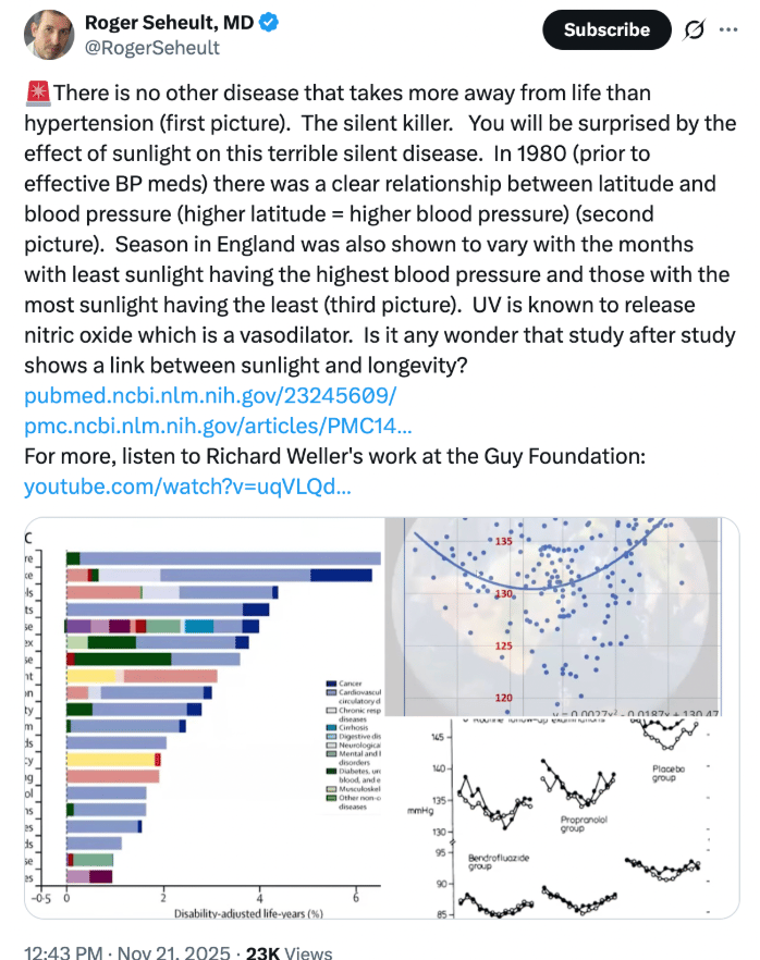You can click the link to learn more, but essentially, there’s some strong evidence that places and seasons with the least amount of sunlight seem to be linked to higher blood pressure. He explains that UV helps to release nitric oxide from the body, which can support lower blood pressure.