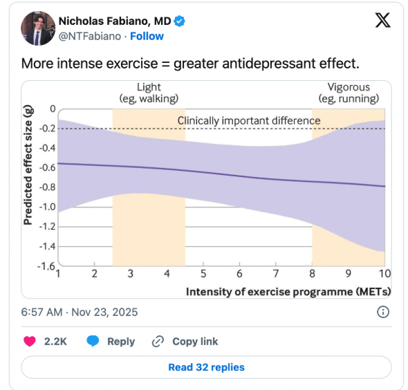 Another major review of 218 clinical trials found that exercise (especially walking or jogging, yoga, and strength training) reliably reduces depressive symptoms. For many people, working out was nearly as effective as therapy or antidepressants!