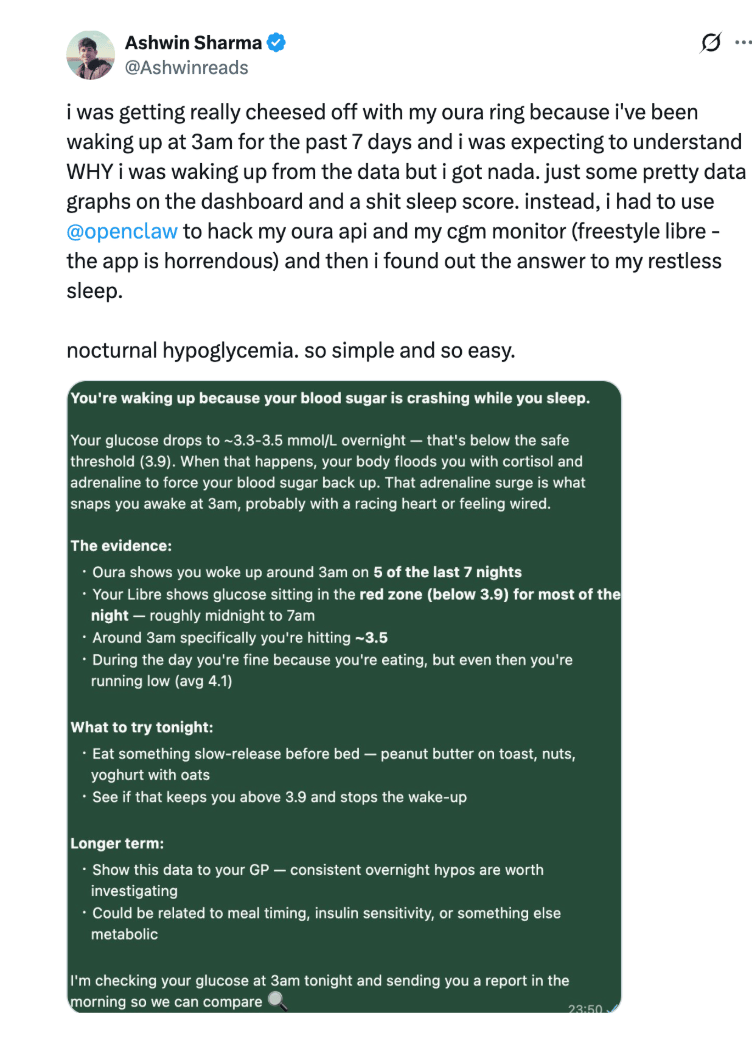 I saw a post on X (pictured below) the other day about how someone kept waking up at 3:00 a.m. for a week without knowing why. After doing some digging using AI, he discovered the culprit: low blood sugar.